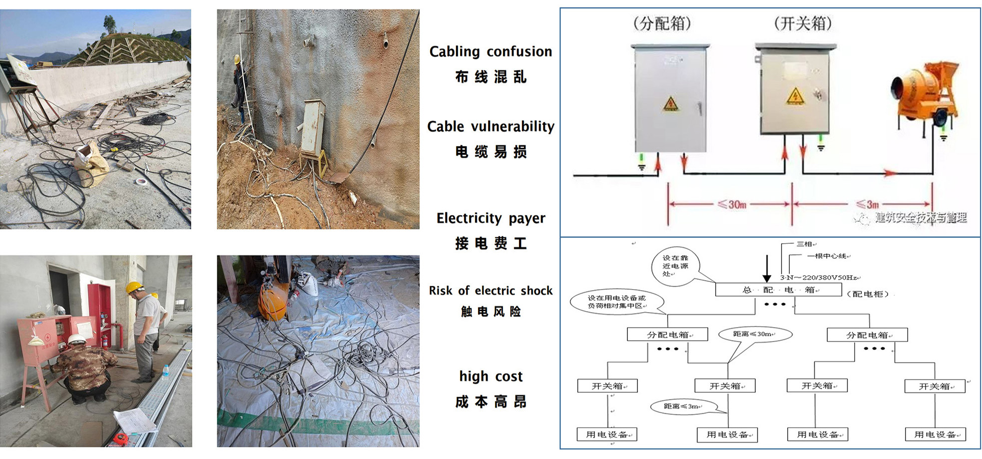 房建工程的工程施工用電是采用配電箱接入市電供電的方式,具有配電箱使用頻次低,現(xiàn)場(chǎng)拉線凌亂、零星、高危等不可避免的痛點(diǎn)。
