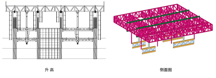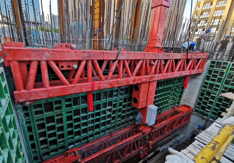◆ 整個平臺、墻模板、懸吊平臺均通過液壓機構自爬,減少塔吊工作量,減少人工,提高工作效率。